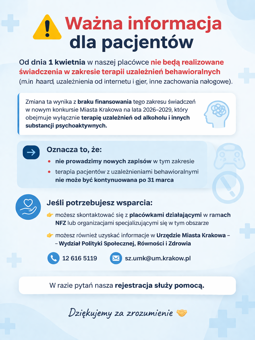 Świadczenia w ramach Poradni leczenia Uzależnień i Współuzależnienia realizowane są na podstawie umowy z Gminą Miejską Kraków zawartą na okres od 1 stycznia 2023 do 31 marca 2026 w zakresie teraii osób uzależnionych i współuzależnionych oraz zagrożonych uzależnieniem i członków ich rodzin, mieszkańców Miasta Krakowa.