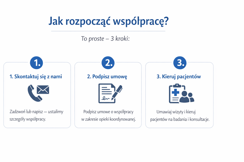 Jeżeli Twoja placówka POZ realizuje opiekę koordynowaną i poszukuje partnera do realizacji konsultacji specjalistycznych oraz badań diagnostycznych, zapraszamy do kontaktu.