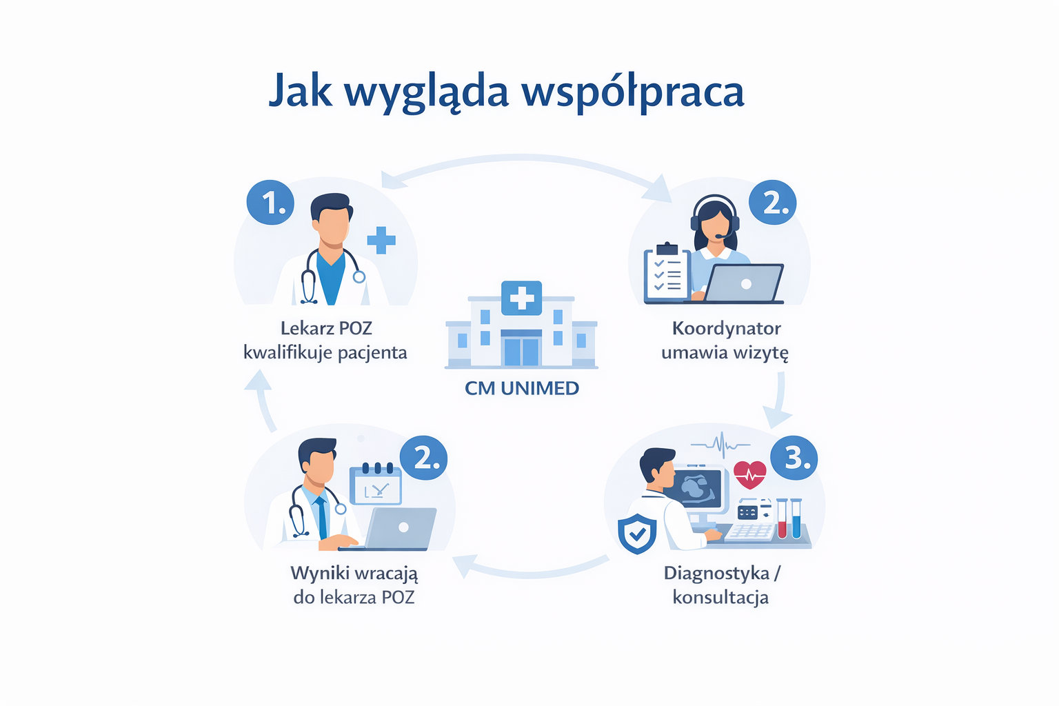 Placówki POZ współpracujące z CM UNIMED mogą kierować pacjentów na konsultacje specjalistyczne oraz badania diagnostyczne w ramach ścieżek opieki koordynowanej.